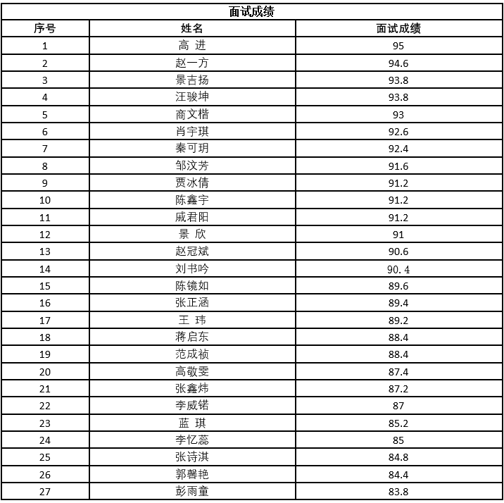 根据《关于pa集团官网选拔优秀推免生担任专职辅导员的通知》,现将面试人员成绩公布如下: