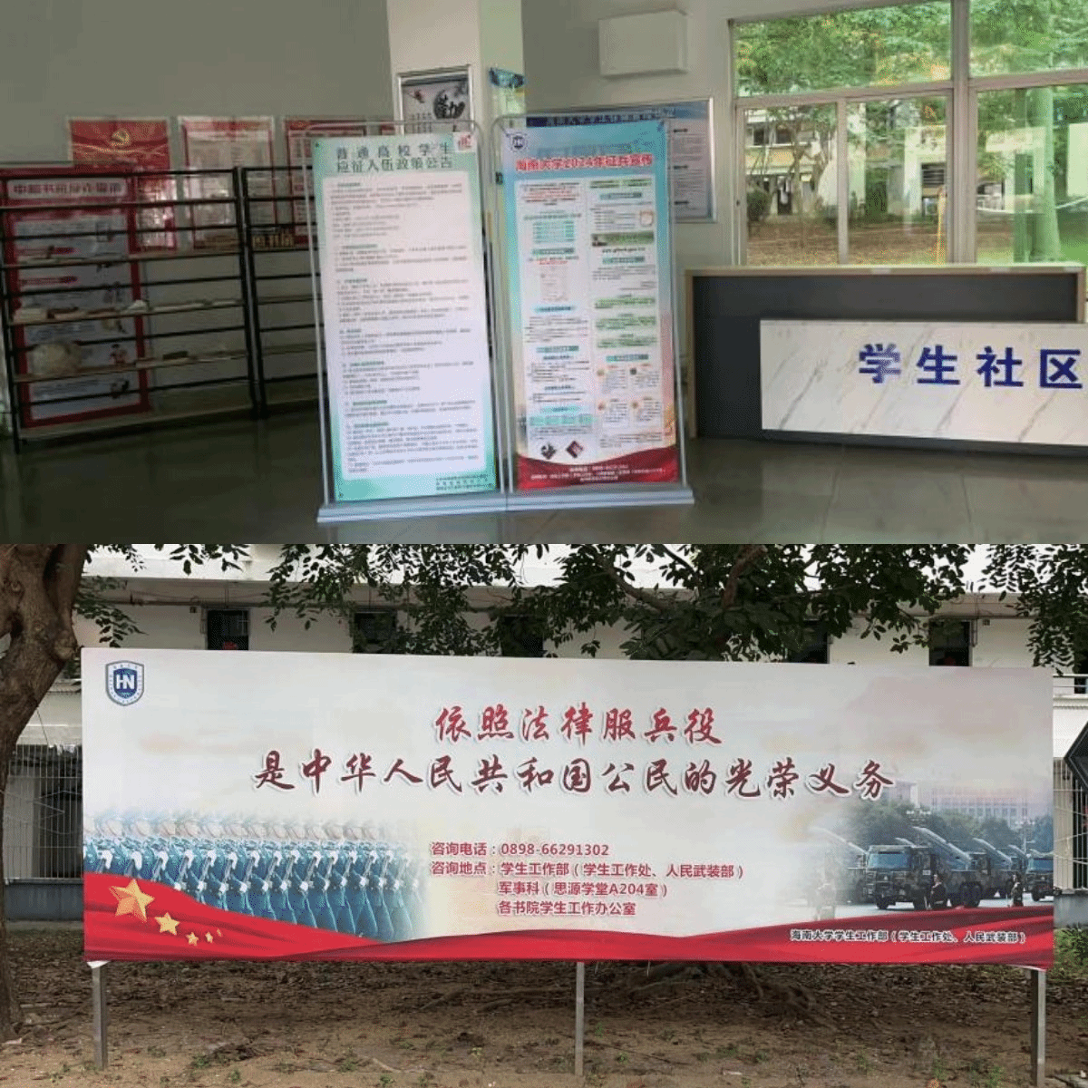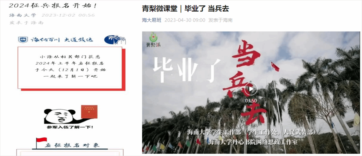 大力开展线上征兵宣传。学校微信公众号转发“中国军号”推文《2024征兵报名开始!》,海大易班公众号持续推送主题宣传片《青梨微课堂|毕业了 当兵去》。武装部向各书院转发“中国军号”《2024年女兵报名时间确定!请转发!》等推文。在思源学堂“一站式”学生社区服务大厅大屏幕滚动播放“入伍政策”“应征环节”“应征时间”“入伍优待”等征兵宣传图片、宣传片。各书院微信公众号陆续推出征兵宣传推文。