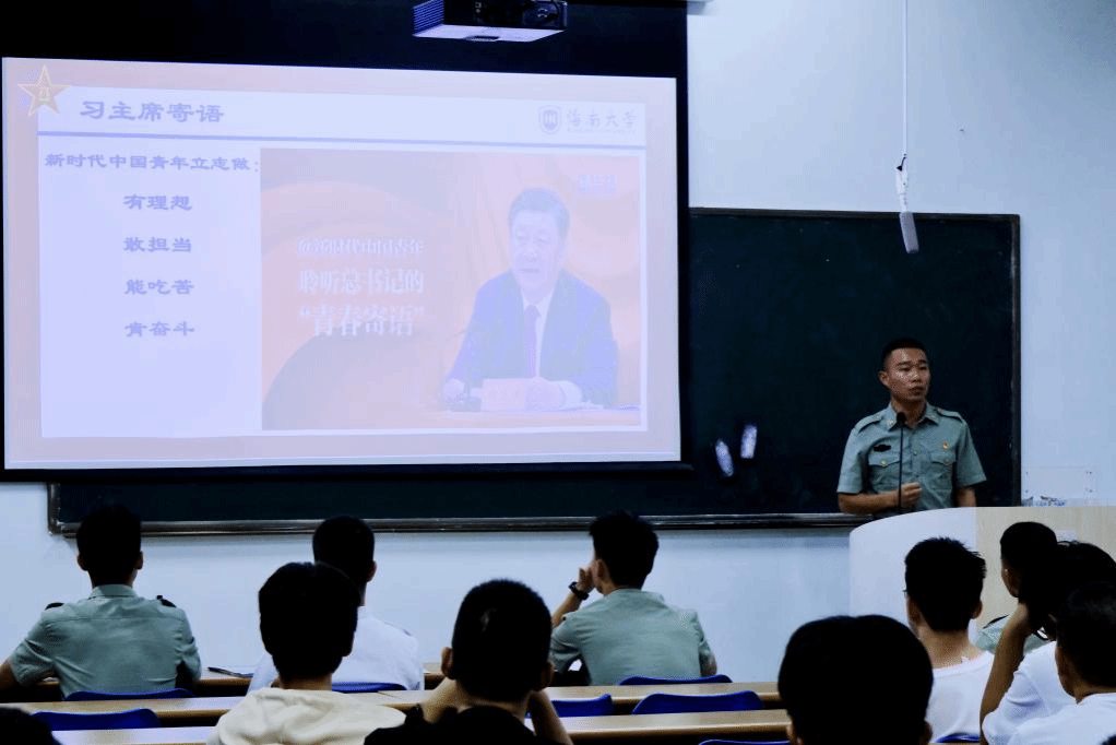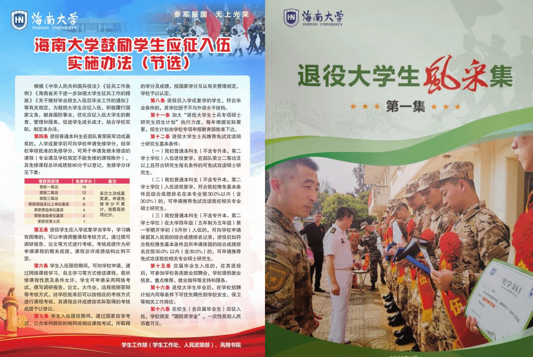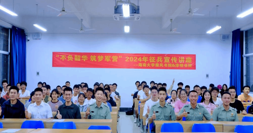 深入开展线下征兵宣讲。学校高度重视征兵宣传工作,在各种招聘会上设置“征兵政策咨询处”,精准向毕业生宣传征兵政策与咨询答疑。校党委常务副书记张继友亲临招聘会现场指导征兵宣传工作。武装部成立“青梨·卫蓝国防教育宣讲团”,宣讲团由5名退役大学生组成,其中研究生3人、本科生2人,宣讲题目分别为《勇敢的选择 崭新的开始》《绿军装迷彩梦》《生而逢盛世 青春当有为》《边关有兵已长成 强国有我请放心》《我很庆幸自己 曾经是一个兵》等,各书院可通过“海大易班”微信公众号预约“青梨宣讲团”实现宣讲进书院、进学生社区。此外,丹心书院开展“丹心学子进军营”、椰风书院开展“社区大学生应征入伍宣传咨询”、淳明书院开展“退役大学生分享交流会”、朴诚书院开展“军事技能教学小课堂”等多场主题宣传活动。