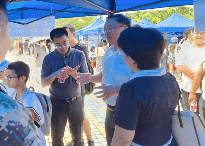 校党委常务副书记张继友(中)在招聘会上指导征兵宣传工作