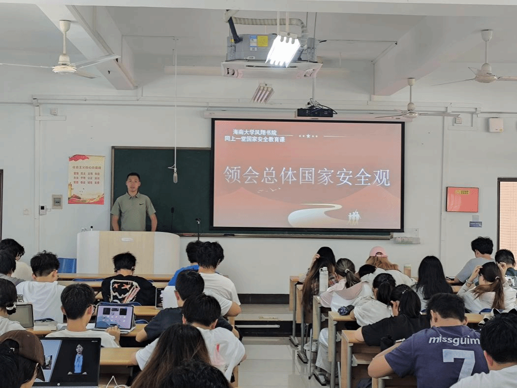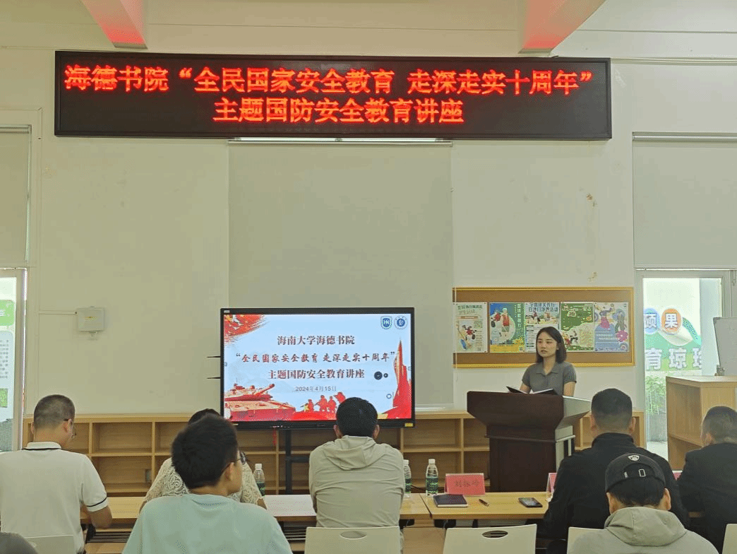 海德书院特邀校外国防教育辅导员开展国防安全教育讲座,围绕参军报国、军事科技、南海历史和军旅经历等主题进行分享,为师生带来了一场内容丰富,形式生动的国防教育课。椰风书院通过横幅签名、手抄报展览等形式,生动普及国家安全知识。子衿书院联合椰城海关举办"4·15全民国家安全教育日"宣传教育活动,采用"室内授课+户外宣讲"双线联动形式,切实提升师生国家安全意识。朴城书院通过制作保密公益宣传片、设计宣传海报、设置国家安全知识展板及开展专题课堂讲座等多元形式,全方位强化师生国家安全意识,筑牢校园安全防线。