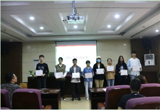 会议第五项,所有获奖同学和决赛参与同学都领取了各自的精美奖品。会议最后,全体知识竞赛参与人员合影留念。