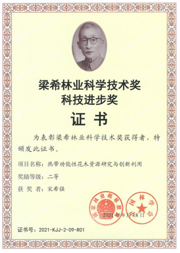 林学院宋希强团队完成了“热带功能性花木资源研究与创新利用”,该项目成果以热带功能性花木资源为主要研究对象,进行种质资源的挖掘、保存及优质种质的筛选,制定配套栽培技术及标准,建立生产示范基地、开展技术培训进行推广应用,联合攻克栽培及推广应用中的难题,主要成果包括:(1)建立热带功能性花木种质资源评价体系和筛选体系,收集保存了优良种质资源 1530 份,筛选出具有巨大市场开发价值的功能性花木种质资源 50 份,有效解决了优良种质少,种质流失严重的问题。(2)攻克了种苗快速繁育及生产配套技术,构建了生产栽培技术配套体系 8 套,实现了种苗规模化、标准化生产,解决了种苗繁育效率低、效果差的难题。(3)创制了功能性花木植物加工新技术和创新产品,与企业合作,研发了功能性花木加工新技术和创新产品 18 个,推进“大产业+新产品”的发展模式,解决了产品开发过程中品质差、利用率低的技术瓶颈。