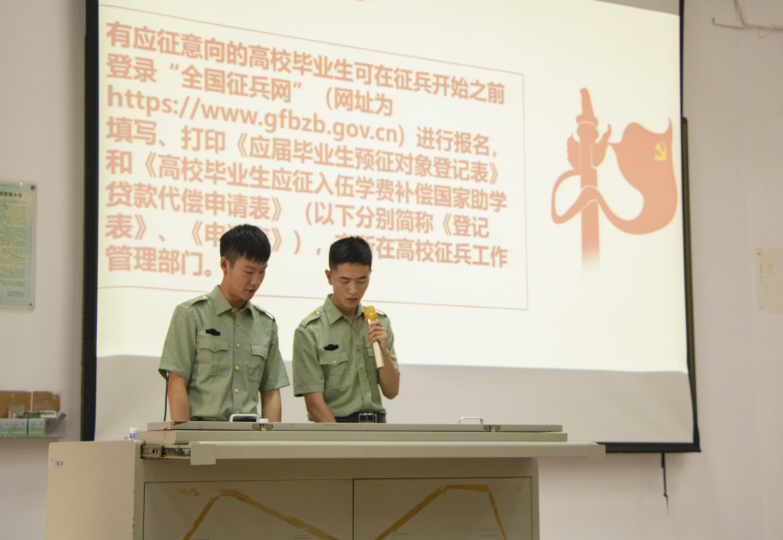 接着,退役士兵代表焦存亮、仙一航共同给同学们进行了征兵国防教育。征兵教育分为两部分,一是军旅生活介绍,二是入伍政策解读。退役士兵代表对征兵入伍政策进行了解读,对参兵流程,基本要求以及培养前景等方面做了详细介绍,并给同学们的提出的问题进行了解答。