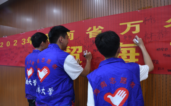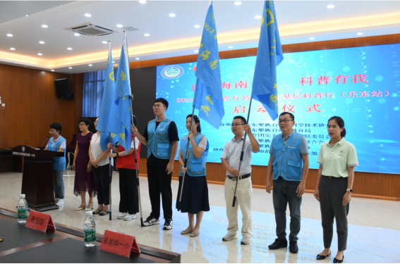 活动共分两个阶段,第一阶段启动仪式。仪式上,pa集团官网唐江渠同学作为大学生志愿者代表上台发言并接受电视台采访,他讲述了科普的意义和大学生想为自贸港建设贡献一份力量的想法。乐东县志愿者代表发言后,县科协党组书记陈青致辞,他强调:科学是一个系统的整体,我们要通过科普活动,让大家对一些日常生活中常见现象、问题进行科学的分析、推理,透过现象看本质,继而达到“一法通,万法明”的效果。紧接着,县领导向来参加科普活动的高校大学生队伍授旗,志愿者们在台上挥舞着旗帜,齐声喊出“自贸海南,科普有我”的口号,随后志愿者们纷纷在科普横幅上签上自己的名字,把启动仪式推向了高潮。