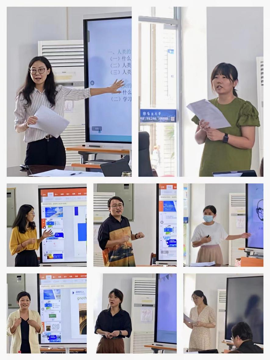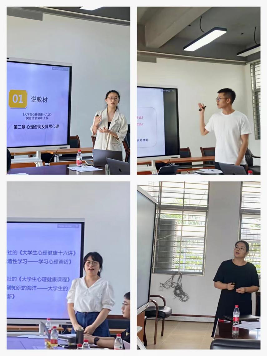 在理论课集中备课环节,按照教学大纲章节顺序,四个小组将假期备课情况进行了汇报;同时七位在暑假参加“大学生心理健康教育课程专项培训”的老师,逐一分享了学习成果。教研室成员也纷纷结合授课情况发表个人想法,碰撞思维火花。