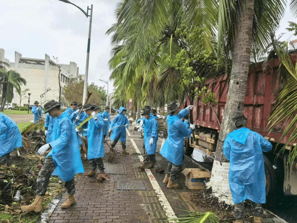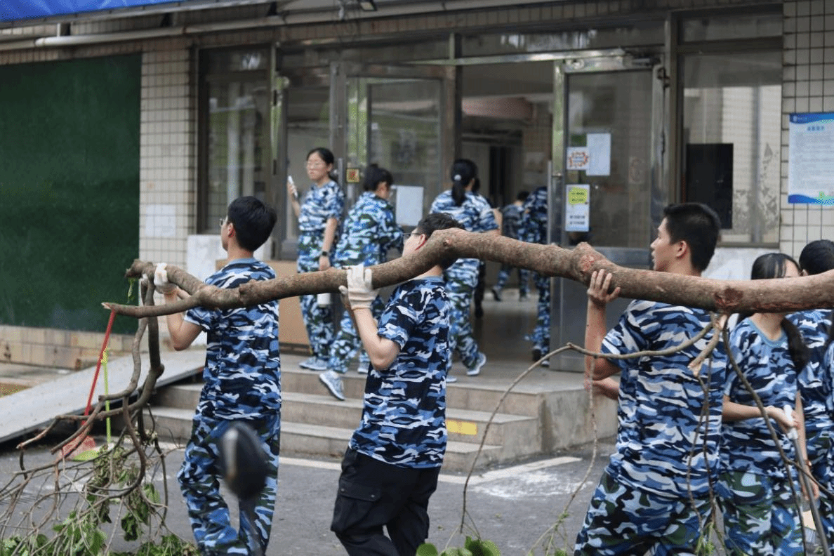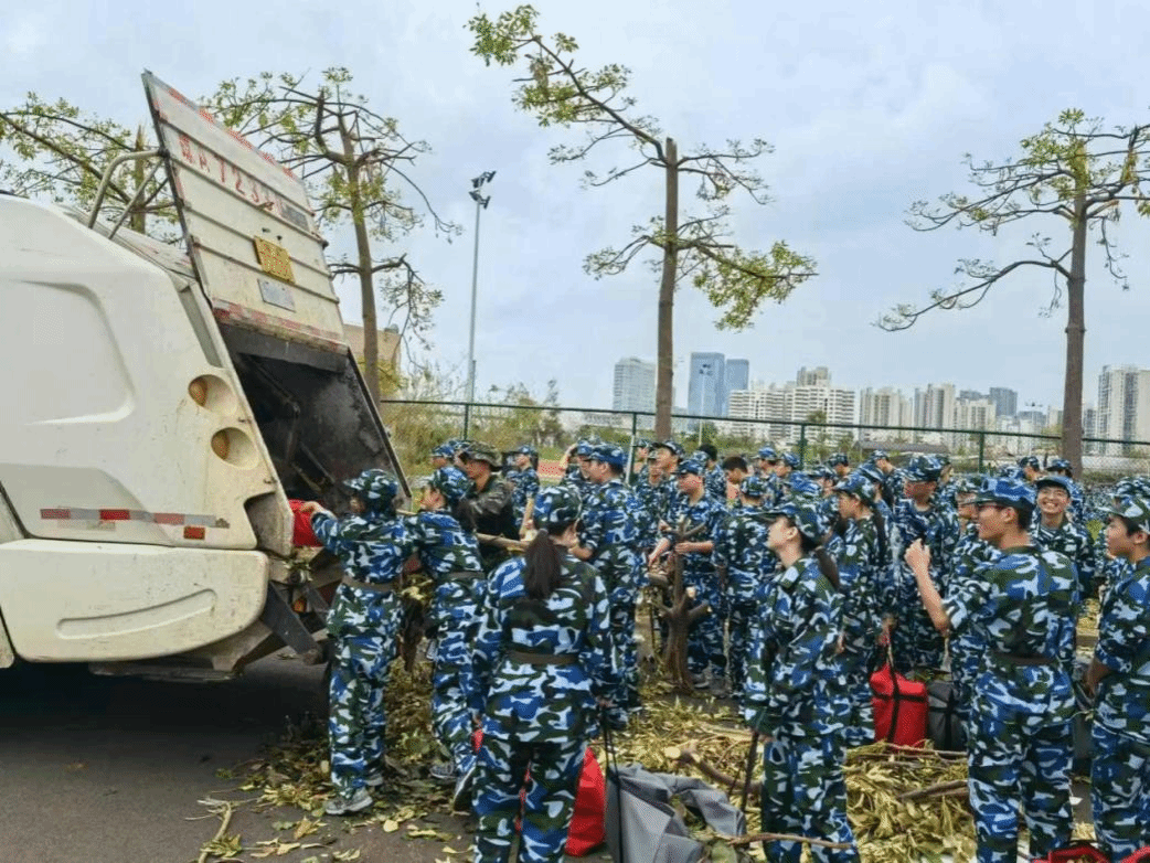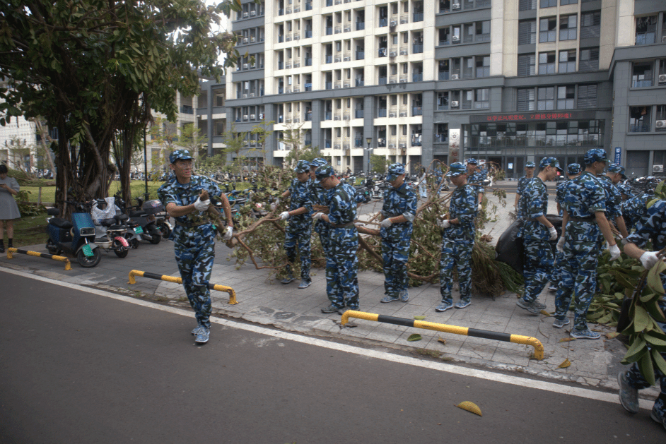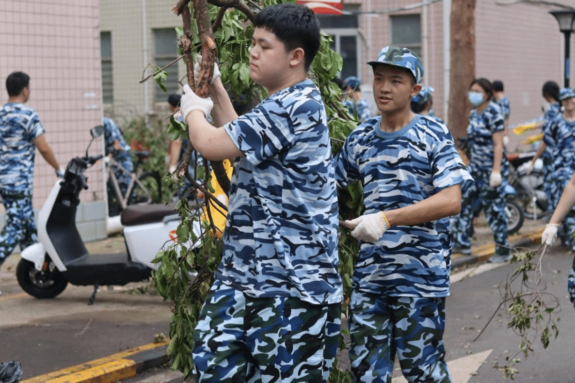 承训教官和辅导员以身作则,2024级新生发挥主人翁精神,边训练、边劳动,随时待命、随时出发至清障地点,聚拢垃圾,清扫落叶,堆放树枝,协助装车,扶正电动车、自行车,恢复校园,净化社区环境。