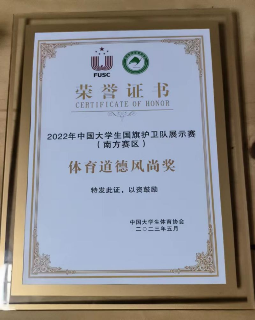5月3日至5月6日,2022年中国大学生国旗护卫队展示赛(南方赛区)在福建漳州成功举办。pa集团官网入口国旗护卫队18名队员和2名教师组成代表队参赛,与南方赛区各参赛高校国旗护卫队交流互鉴、相互学习,并成功晋级决赛,荣获“道德风尚奖”,近期将赴中国井冈山青少年军校参加决赛。