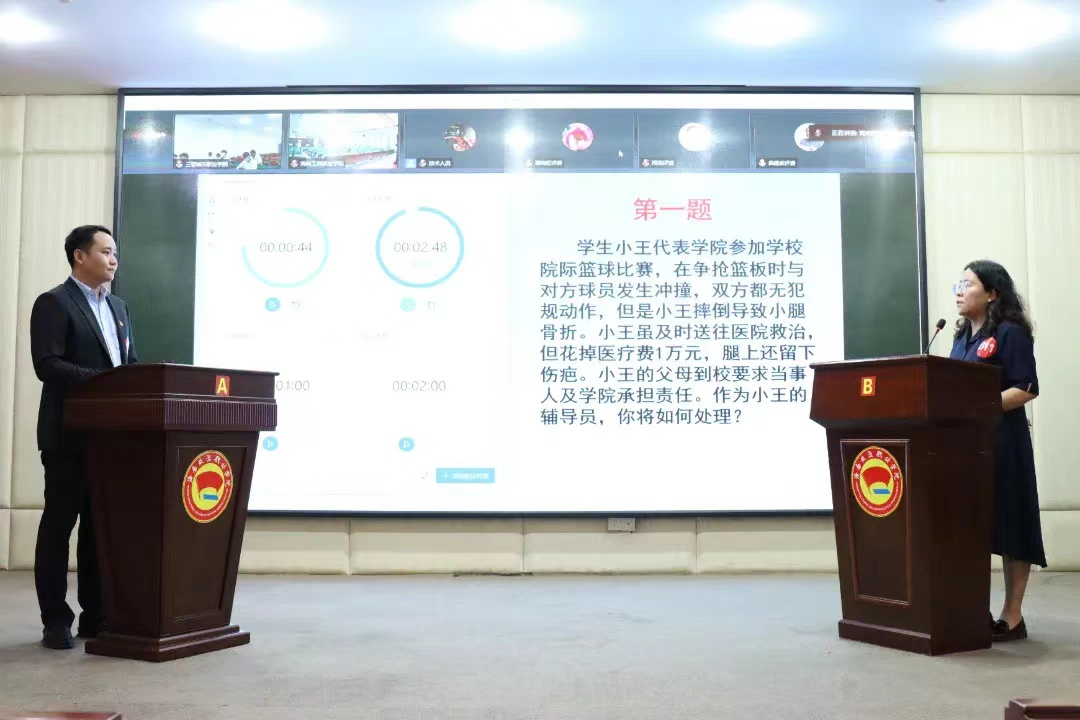 大赛首次采用线上直播的方式,pa集团官网学生工作部(学生工作处、人民武装部)组织全校学工队伍人员在海甸校区社科楼二楼报告厅实时观战,作为大培训活动之一,有效地提高了pa集团官网入口辅导员的理论水平、业务能力和职业素养,提升了对辅导员职业的认同感和荣誉感。