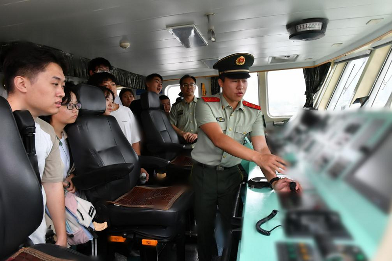 活动中,师生们海警执法员们引领师生们参观了舰艇会议室、住舱、驾驶室等部位,生动讲解了海警执法员们日常学习、训练和工作的基本情况,师生们被海警执法员常年在祖国的万里海疆上用辛勤和汗水坚决捍卫祖国主权和法律尊严的一个个光辉事迹所感动。