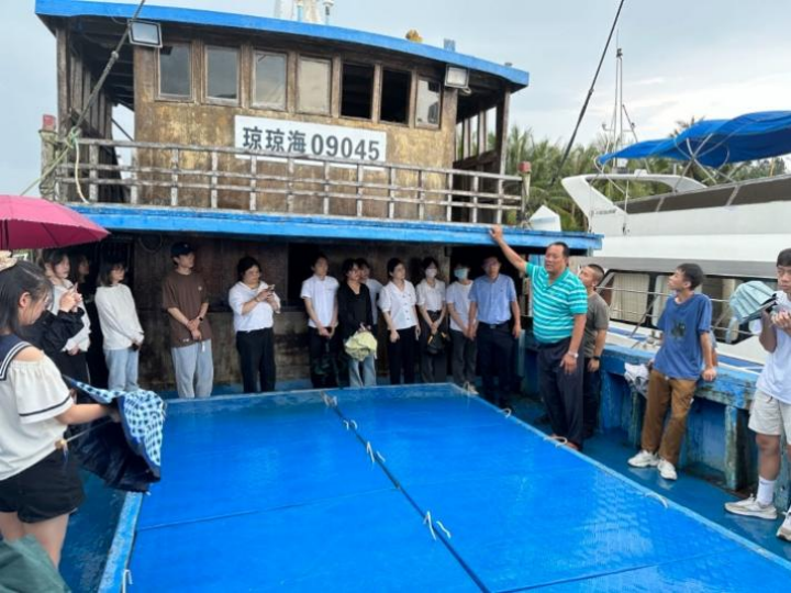 随后,王书茂书记带领同学们登上了潭门码头的琼海09045号渔船,回顾习近平总书记2013年4月8日在这艘渔船上对潭门港渔民的关怀和“造大船、闯深海、捕大鱼”的殷切嘱托。
