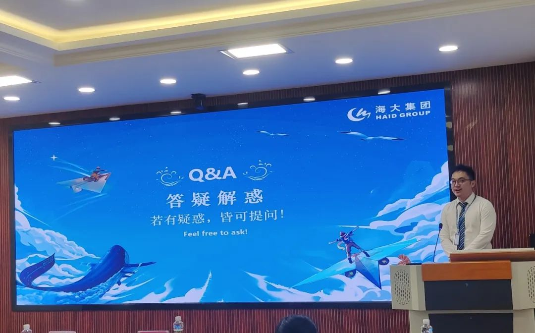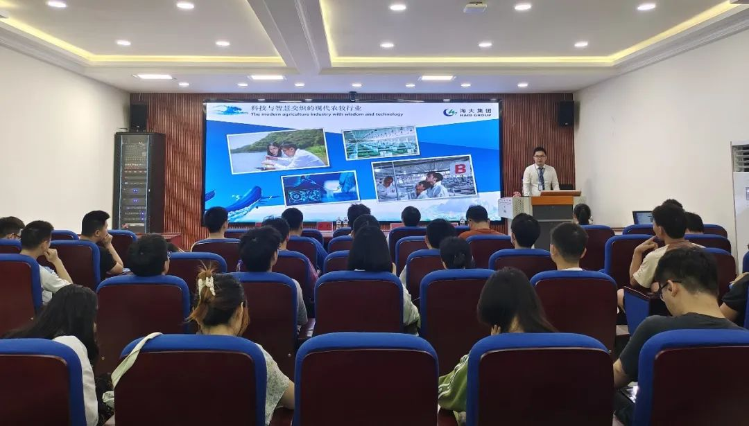宣讲会开始,海大集团人力资源经理宋柏弘对公司概况、业务范围、岗位概况、晋升和培训通道等方面进行了全面介绍。同时,他着重对实习具体情况以及就业岗位进行讲解,并热情欢迎海大学子们积极报名。