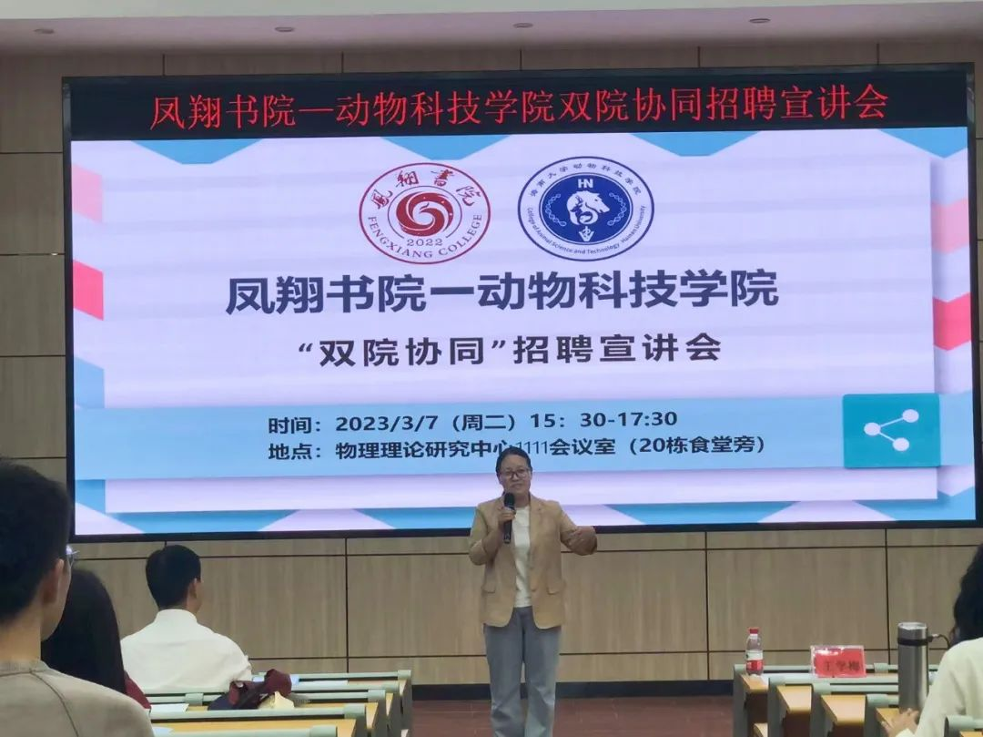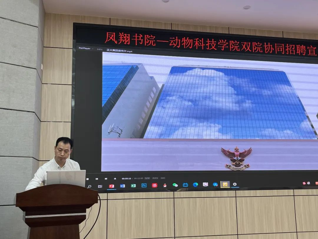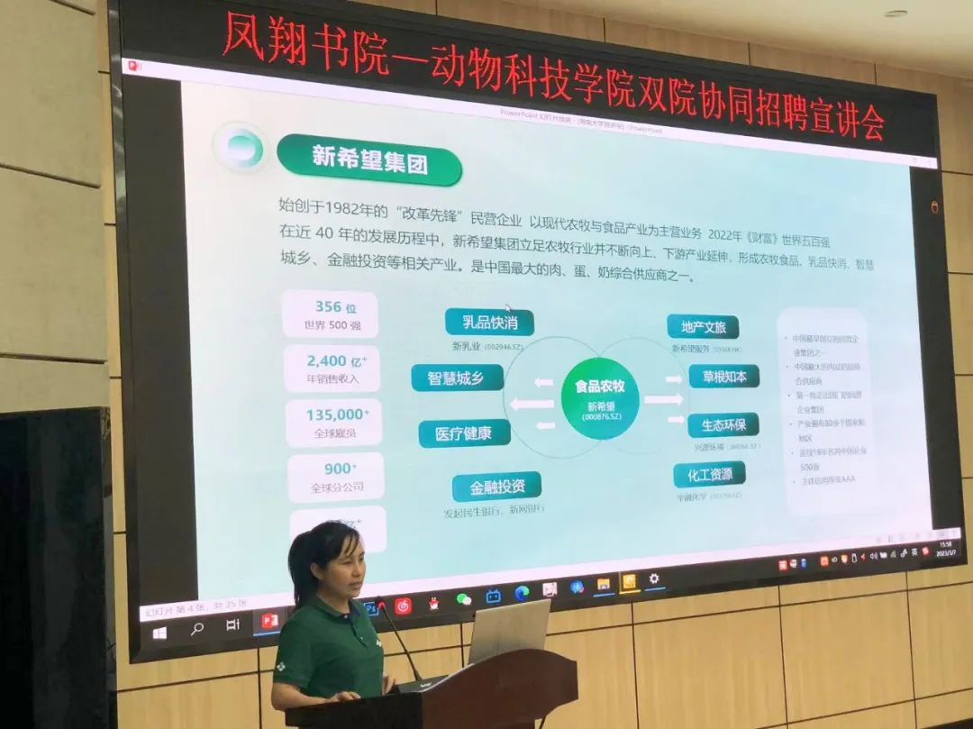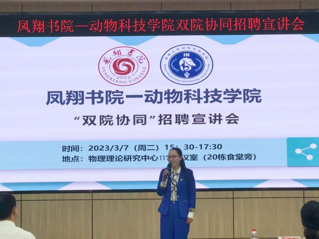 为搭建供需平台,提供更加优质的就业资源,促进书院毕业生积极就业,实现毕业生与用人单位双向选择、互利共赢的目标,凤翔书院-动物科技学院“双院协同”招聘宣讲会于2023年3月7日在物理理论研究中心1111会议室顺利举办。此次宣讲会邀请到了新希望集团海南战区人力总监韩佳琭,人力经理李晓靓、胡莲丽,正大集团销售副总经理李阳,人力主管赵光秘。出席会议的还有动物科技学院副院长王学梅、就业负责人李笑春,凤翔书院正处级辅导员梁丽仪、就业负责人卢茜。