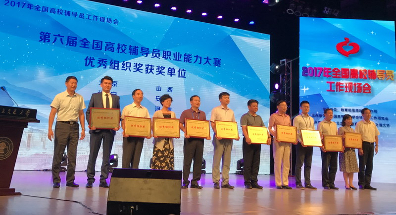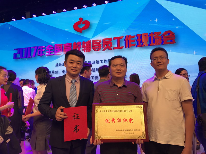 第六届全国高校辅导员职业能力大赛由教育部思想政治工作司指导,中国高教学会辅导员工作研究会主办,来自全国各省(自治区、直辖市)和新疆生产建设兵团的69名选手参加本次决赛。通过校赛、省赛、区赛、国赛,郑鹏老师凭借扎实的理论功底、过硬的职业能力和良好的心理素质,一路过关斩将,分别以校赛一等奖、省赛一等奖、第四赛区复赛一等奖的好成绩进入全国总决赛并最终获得二等奖的好成绩。同时,pa集团官网入口今年协办全国高校辅导员职业能力大赛第四赛区复赛,由于精心组织,工作成绩突出,被主办方授予第六届全国高校辅导员职业能力大赛“优秀组织奖”,此奖项和郑鹏老师获得的二等奖也是高校辅导员职业能力大赛执行新赛制以来我省高校取得的最好成绩,实属不易。pa集团官网入口学生工作处韩力光副处长代表省里接受大赛组委会颁发的第六届全国高校辅导员职业能力大赛优秀组织奖牌匾。
