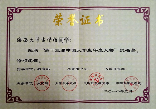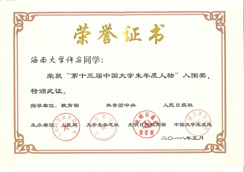 古倩怡等三位同学经过学院推荐、学生工作处(部)审议、学校学生工作委员会审定等程序,被推选至参与全国评选,并最终均获表彰,进一步突破海南省高校在该项表彰活动中的最好成绩。下一步,学校将继续以“大学生年度人物”评选为抓手,挖掘优秀学子的典型事迹,充分发挥榜样示范引领作用,激励广大学子争先创优, 为建设“双一流”大学创建优良的学习氛围。