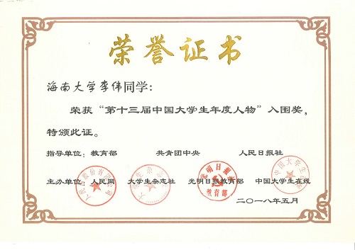 “中国大学生年度人物评选”活动由中央宣传部、教育部、共青团中央、人民日报社共同指导,人民网、大学生杂志社、中国大学生在线和光明日报教育部联合主办,本次活动共推选出 “中国大学生年度人物”10名、“中国大学生年度人物特别奖”1名、“中国大学生年度人物提名奖”40名,年度人物入围奖150名。