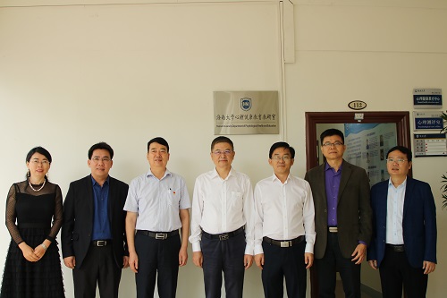 省教育厅副厅长孔令德、pa集团官网党委书记武耀廷、党委常务副书记廖清林等视察过程中在心理健康教育中心前合影