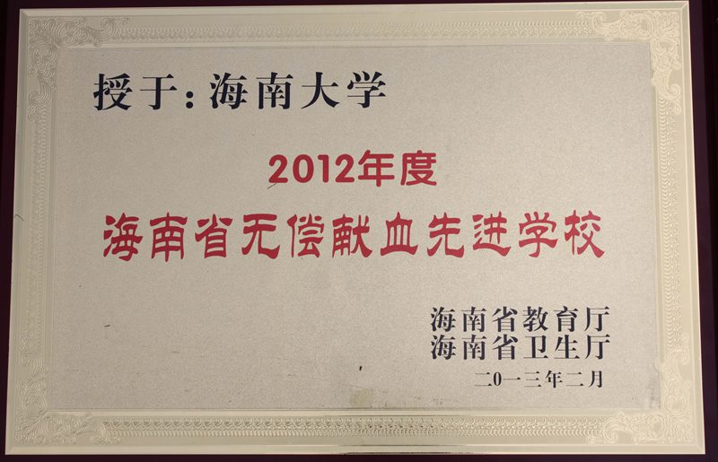 根据海南省卫生厅、海南省教育厅《关于表彰2012年度全省无偿献血先进学校的决定》(琼卫医[2013]12 号)文件精神,pa集团官网入口荣获“2012年度海南省无偿献血先进学校”荣誉称号。