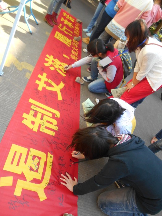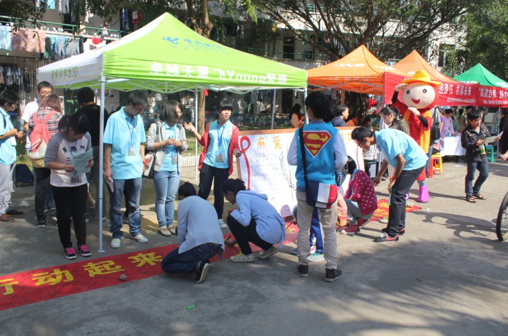 为了扩大宣传教育的影响力,这次活动分别在第二食堂和旅院食堂前两个场地展开。活动主办方热情积极地向路过同学进行宣传,吸引到越来越多的同学参与活动。有些人在横幅上留下签名,留下祝福,以及对防艾滋病活动的支持;有些人积极参加有奖竞答,答题时有的得心应手,有的绞尽脑汁,大家在赢取小奖品的喜悦同时也收获了知识。活动现场气氛活跃又温暖,郑重的签名、有趣的游戏,同学们在互动中留下了欢声笑语和真诚祝福,带走了“防艾”知识和“关艾”意识。特别是现场专门准备的两个可爱的大型吉祥物——布娃娃与同学们互动,引得大家来拥抱合影,热情洋溢,传递温暖和微笑。