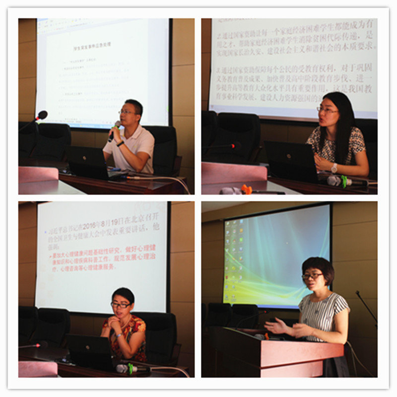 培训会上,学生工作处综合科林勇老师以“学生日常事务导航”为题,从学生日常事务管理、突发事件处置等方面向新入职辅导员介绍了日常工作的主要板块、在工作中常见的问题以及处理方式。学生助学贷款与资助科王静老师从资助的重要意义、国家主要的资助政策、pa集团官网资助工作的相关情况以及资助工作实施路径等几个方面为大家进行讲解。心理健康教育中心吴九君教授从心理健康教育的意义、心理健康工作如何开展等内容对新辅导员进行 “大学生心理工作入门”指导。法学院学工办主任张晓凤博士以“坚守与成长”为题,分享了自己在辅导员工作岗位上的成长与收获。