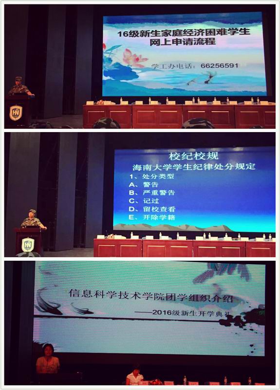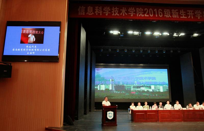 信息科学技术学院2016级新生开学典礼暨入学教育在思源学堂大礼堂隆重举行。学院领导、各系主任、优秀校友代表在主席台就坐,2016级班主任、学工办老师以及2016级全体新生七百多人出席。典礼由蒙秋妍副书记主持。 大会分三个阶段:第一阶段开学典礼,第二阶段专业教育,第三阶段入学教育。第一阶段大会在全场热烈的掌声中拉开帷幕。典礼上,饱含着对2016级新生的殷切期待和美好祝愿,黄梦醒常务副院长发表了热情洋溢的讲话。黄院长为新同学介绍了学院发展历程和取得的丰硕成果。他勉励同学们在大学期间保持坚定的理想信念,要学会思考、学会学习、学会做人,以生动的案例阐释新时代的青年人要勇于承担责任、诚信做人、感恩父母、报效祖国。 优秀校友代表、海南酷秀投资控股有限公司总裁王海峰先生寄语新生:敢于有梦,敢于拼搏。电子信息工程系任佳博士代表教师发言,他鼓励新生们保持好奇之心,不断探索,并明确表示,学院全体老师都愿意随时接受同学的提问,满足同学们的好奇心。2013级通信工程专业的甘蕾同学和2016级电子类专业姬森原同学作为老生、新生代表分别在典礼上发言,老生传递经验、新生怀揣期待,都表示要珍惜学校大舞台,铸就青春好风采。 第二阶段,各系主任分别对专业的学科背景、发展现状、研究内容、主要课程、机遇与挑战等进行了生动有趣的介绍,同学们听得津津有味,表现出了深厚的专业兴趣。入学专业教育促进了新生对所学专业的较全面的认识,引导学生培养专业兴趣,明确学习方向。 第三阶段,学工办老师分别对学籍管理、校纪校规、奖助学金、团学组织等方面开展了教育。 至此,信息科学技术学院2016级新生开学典礼暨新生入学教育圆满结束。
