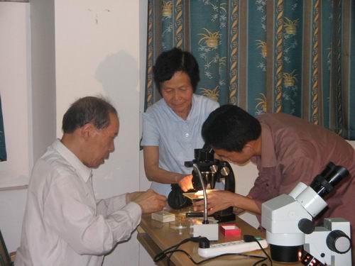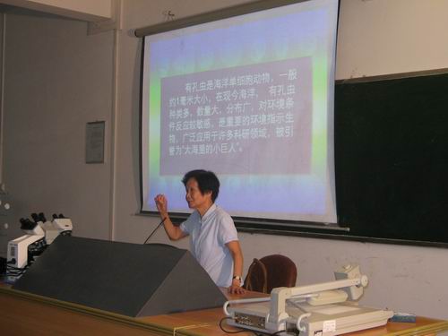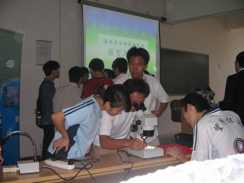报告会前后,郑守仪院士将珍贵的有孔虫模型实物、照片讲解给大家观察,用多媒体给大家展示了种类繁多、形态各异的有孔虫模型以及其他海洋微生物的图片,同时还让大家在显微镜下观察了有孔虫的形态,使师生们大开眼界。