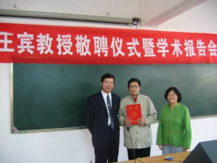 林强副校长为王宾教授颁发聘书并与曹玲娟院长合影