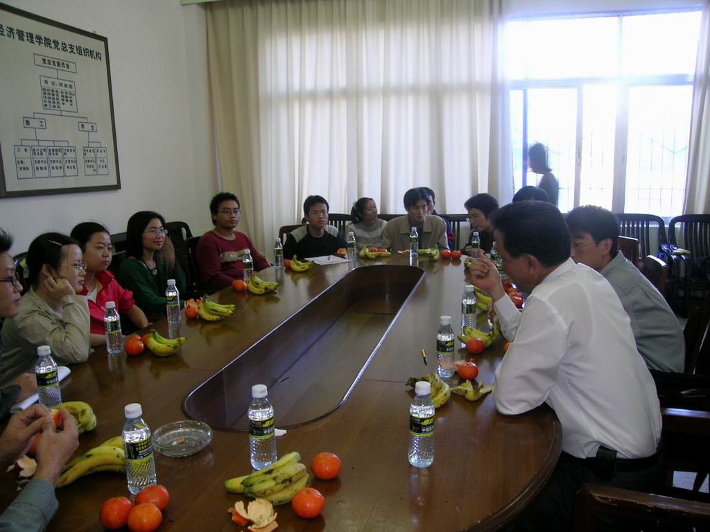 2004年12月16日下午4:40,在经济管理学院会议室召开中美大学生经验交流座谈会。经济管理学院院长黄景贵教授主持了座谈会,学院党总支符史岱书记也出席了座谈会,座谈会请来了香港著名企业家、运豪集团彩能控股有限公司董事长陈晓晖先生及其在美国读大学的儿子Dale等,我院2001级四个专业的部分学生参加了此次座谈会。