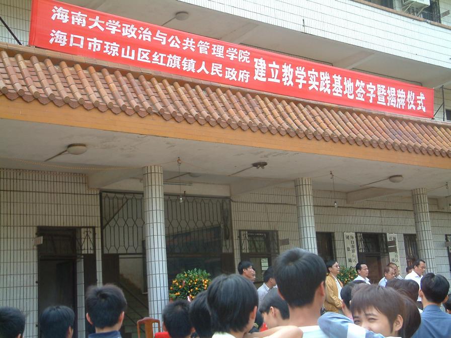 3月17日下午,我院与海口市琼山区红旗镇人民政府教学科研实践基地协议签署仪式在琼山区红旗镇政府办公楼前隆重举行。出席本次签署仪式的有红旗镇党委王海书记、欧辉富镇长、何家汉副镇长等红旗镇委,镇政府班子全体成员、镇属村干部、中学生,政治与公共管理学院党总支王默忠书记、学工办唐名胜老师等。