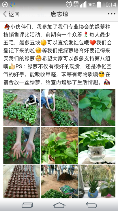 “绿萝种植与销售”创业体验活动自2015年11月15日起进入种植阶段。参加活动的同学被分为十个小组进行比赛。平整土地、引进绿萝苗、分根分盆、种植养护、防治病虫害等都由各小组成员协作完成。同时,为增强学生创业体验效果,要求种植阶段资金必须由小组成员向同学们众筹所得,众筹金额设立上下限,为1-5元。一时间,同学们分工合作,查阅资料、下基地劳动、通过朋友圈等各种途径众筹,活动热情高涨。为保障绿萝种植活动顺利开展,协会于11月21日邀请园艺系陈萍老师进行种植养护与防治病虫害的专业指导。同时,在种植期间,多次组织小组间的经验交流会。