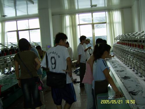 师生们在参观服装厂的绣花车间