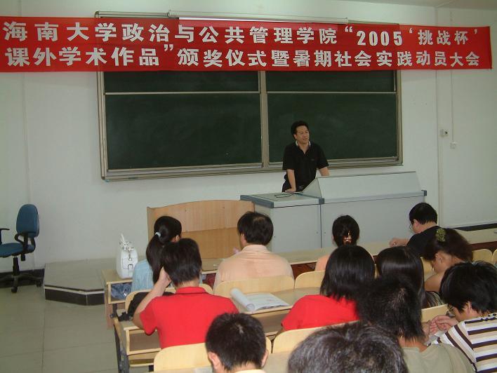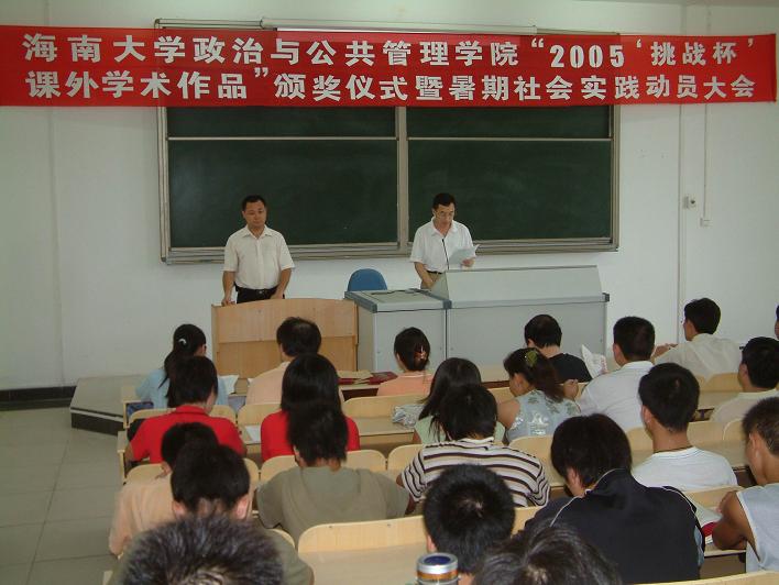 为了进一步推动我院教学实践与科研活动的深入开展,不断提高学生的创新精神与实践能力,2005年6月21日下午,政管学院在3-210召开全院师生大会,隆重举行“政治与公共管理学院2005年‘挑战杯’课外学术科技作品颁奖仪式暨暑期社会实践动员大会”。大会由副院长胡斌武博士主持。 在颁奖仪式上,首先由副院长李德芳教授宣读《pa集团官网政治与公共管理学院关于表彰2005年“挑战杯”课外学术科技作品竞赛优秀论文和优秀指导教师的通知》。接着,张治库院长给获论文优秀指导教师奖的李芬、李德芳、王章佩、沈德理四位教师颁发了证书及奖金;党总支王默忠书记给获奖的优秀论文作者代表颁发了奖金。 颁奖仪式结束后,张治库院长对即将到来的暑期社会实践活动作了动员,他要求全院师生要重视学生创新精神和实践能力的培养,通过社会实践来加强教师对学生科研能力的指导,调动学生社会实践的热情和积极性,推动我院实践性教学工作的持续开展,以逐步形成我院的办学特色。 最后,由获得本次“优秀指导教师”奖的李芬老师给全院学生作了“社会实践调查与调查报告写作方法”的讲座。