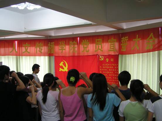 7月1日下午3点,我院学生党支部75名党员和部分入党积极分子齐聚学院会议室,隆重举行新党员宣誓大会。 会上党总支书记刘雯致辞,向新党员表示热烈祝贺,并要求他们在今后的工作学习中,充分发挥党员的模范带头作用。随后,自去年12月以来加入党组织的54名党员面对党旗,庄严宣誓,决心为共产主义事业奋斗终身。 宣誓完毕,新党员代表和入党积极分子代表也分别向党表了决心。 宣誓大会肃穆而热烈,在庄严的《国际歌》声中结束,使在场的每一位党员都重温了入党誓词,受到了一次很好的党员先进性教育。