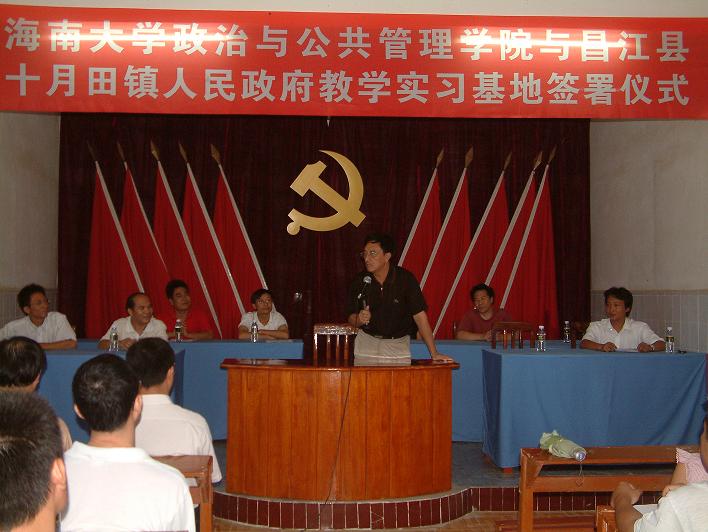 全体党员先后参观考察了棋子湾、石绿铁矿、革命老区和文明生态村。29日上午,政管学院一行来到昌江县十月田镇,与当地镇政府举行了隆重的教学实习基地合作协议签署仪式。参加人员有昌江县委常委兼宣传部部长王文平同志、十月田镇的镇领导和干部、pa集团官网党委书记赵康太教授、校党委宣传部部长王志芳教授、政管学院的领导和老师们。仪式由十月田镇党委书记何顺劲同志主持。