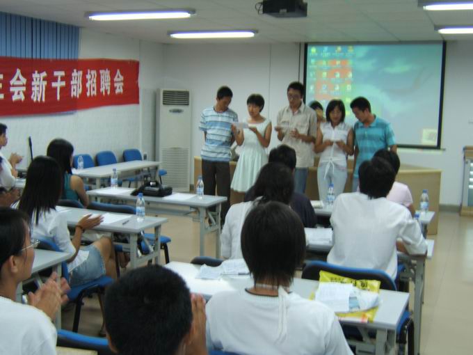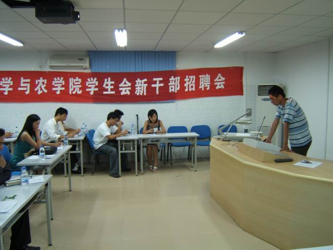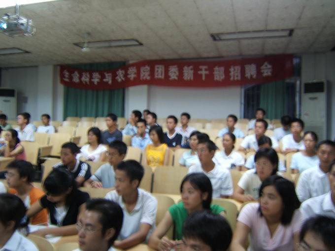 2005年10月6日晚,生命科学与农学院学生干部招聘大会隆重举行,学院有近140名同学报名参加应聘,主要是05级的新同学。本次大会分两个招聘会场同时举行,学院团委书记何欢宝、学工办李丹老师亲临现场指导。