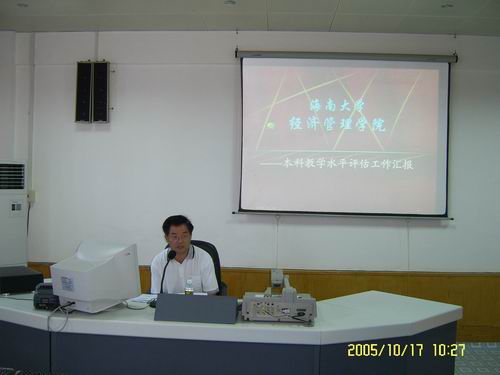紧接着黄景贵院长在多媒体教室做了《经济管理学院教学本科水平评估报告》的汇报。报告从学院概况、教学管理、办学特色、发展规划四大方面对学院的教学本科水平评估情况向学校评建领导小组做了详尽的汇报,报告内容丰富详实、数据充分。林强副校长等人认真听取了黄景贵院长的报告,并提出了许多宝贵的意见:第一、学院层面的数据,特别是院长汇报材料中的所有数据都要落实,与学院上报评建办的材料一致;第二、在学位结构方面,博士学位比例不应该包含“在读博士”的数据;第三、黄院长的汇报中突出了经济管理学院的教学方法、教学方法改革等,但是教学效果、学生质量未提及;第四、汇报材料中的各项规划应以本科专业的规划为主,研究生、科研等方面的规划未涉及本科教学水平评估因此不必过多提及,学院的规划要与学校的整体规划一致。汇报材料可从课程体系、实践教学等方面来体现经济管理学院取得的成绩和效果。第五、汇报材料应该提及我院的实习基地、实践教学、精品课程建设,学生在各类挑战杯、数学建模竞赛中取得的成绩、以及学生参与教师科研等方面的情况从而突出学生培养的质量,进一步显示经济管理学院所取得的教学效果。第六、经济管理学院有一支优秀的兼职教师队伍特别是外籍教师队伍,应提到兼职教师队伍的情况等。最后,林强副校长一行又来到我院评建办公室检查材料准备情况,并针对存在的问题提出了具体改进的措施。