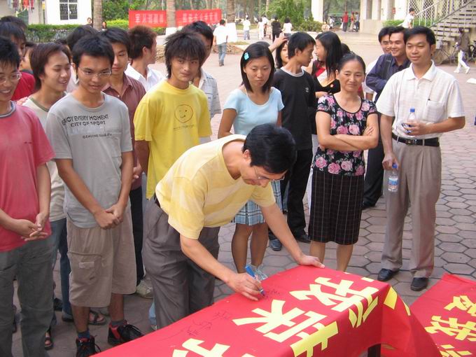 2005年10月24日下午5时,生命科学与农学院04级园林班团支部在学生宿舍区组织以“爱我海大、校兴我荣、我为海大添光彩”为主题的签名活动。参加活动的领导有校督导小组漆绮慧、校科研处处长吴兴亮、院党总支副书记王强、园林系主任林尤河、04园林班主任罗丽华、学工办李丹老师以及学院团委学生会部分学生干部。活动由04园林班学习委员刘帅同学主持。