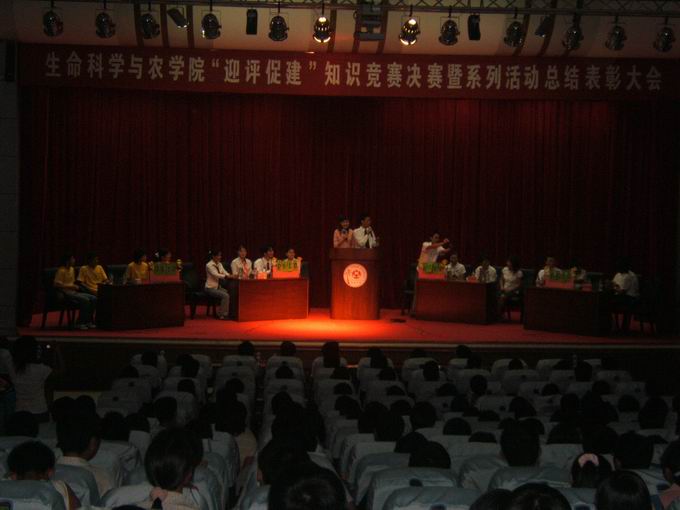 2005年10月27日晚,生命科学与农学院在校大报告厅举行“迎评促建”知识竞赛决赛暨系列活动总结表彰大会,参加大会的嘉宾有校宣传部副部长黄丽芹、校学工处副处长王大群、校团委书记符成彦,学院党总支副书记王强、副院长杨好伟以及院团委、学工办老师和班主任。本次大会分三个部分。