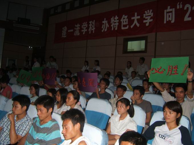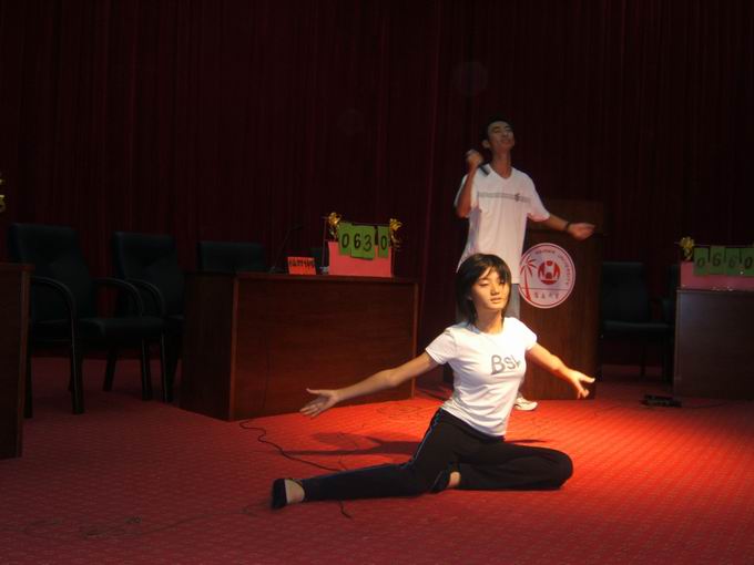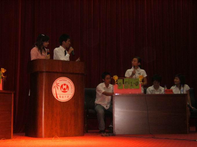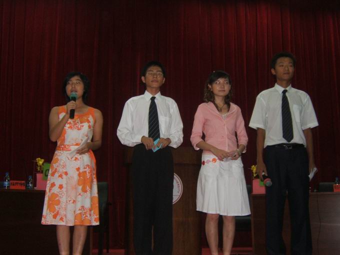 第一个部分是“迎评促建”知识竞赛决赛.进入决赛的四支队伍分别是03园林班的幻V队,03农学班的绿野情缘队,04园林班的龙卷风队和05生物技术班的生命之舟队。决赛题目仍然分为必答题、抢答题和风险题三种。经过近两个小时的角逐,龙卷风队夺得冠军。