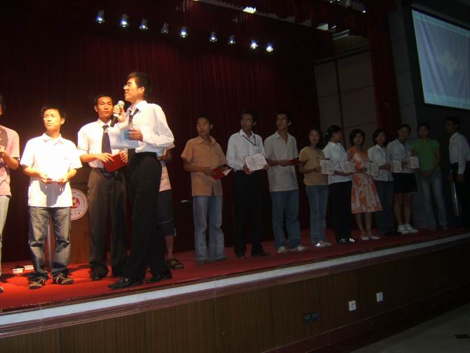 第三部分是颁奖,分别颁发优秀组织班级、知识竞赛、中文演讲比赛、征文比赛、文明宿舍、军训积极分子、优秀社会实践论文、防风救灾先进分子等奖项。