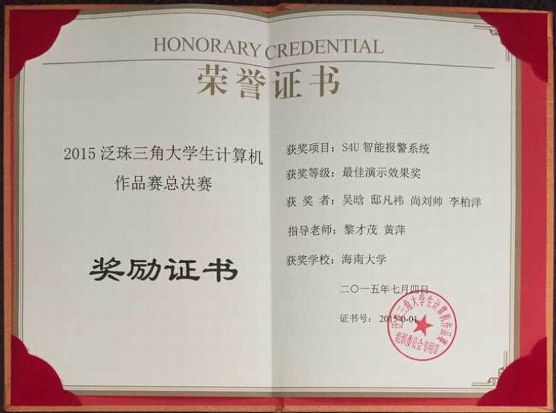 7月3日—4日,第10届“泛珠三角大学生计算机作品赛”总决赛在澳门举行。该竞赛由泛珠三角大学生计算机作品赛组委会主办,澳门电脑学会、澳门理工学院承办,我院学生研发的“S4U智能报警系统”团队代表海南参赛。本次总决赛共有来自40余所高等院校的52个作品200余名大学生参赛。经过两天的激烈角逐,我院的“S4U智能报警系统”团队脱颖而出,荣获最佳演示效果奖和铜奖。这是我省选手参加该项赛事历史上首次获得最佳演示效果奖。该团队成员来自2013级计算机科学与技术专业吴晗、邸凡祎、尚刘帅、李柏洋四位同学,指导老师是计算机系的黎才茂、黄萍老师。
