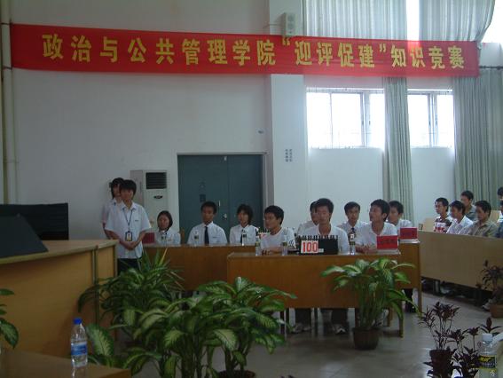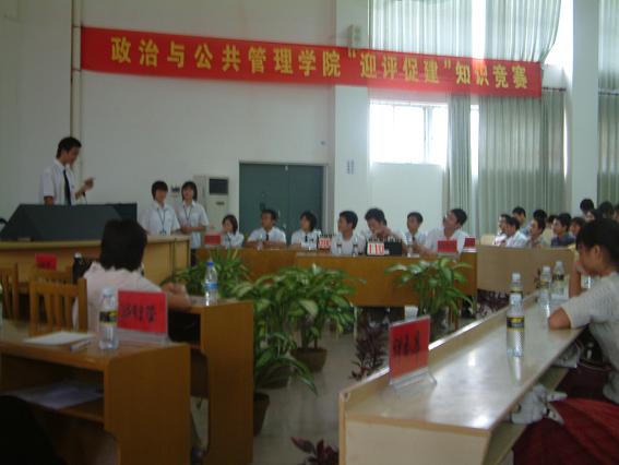 为了使同学们更好的了解评估知识,增加评估意识,提高对评估的认识,经过充分的筹备,我院迎评促建知识竞赛于2005年11月6日在2-108如期举行。 此次知识竞赛共有来自不同年级的6个代表队参加,竞赛包括必答题、风险题和抢答题三个环节。同时,为了调动在座同学的积极性,活跃现场气氛,本次比赛还别出心裁地增加了现场观众回答相关评建知识并赠送小礼品活动。 整个现场气氛活跃,各个代表队配合密切,队员们出色的表现充分展现了我院学生对评建知识的掌握程度。经过激烈角逐,04级行政管理代表队最终夺得本次知识竞赛的桂冠。