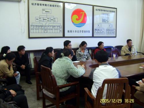 2005年12月29日下午,经济管理学院在学院会议室召开了全体班主任工作会议。学院符史岱书记、黄景贵院长、学工办吴新主任,以及学工办全体辅导员和全院班主任参加了此次会议。