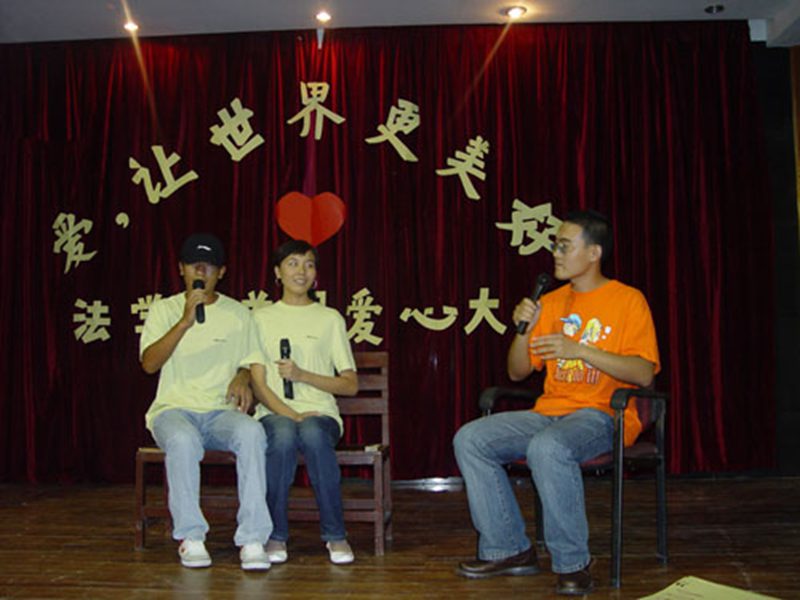 2006年4月20日晚19:40,法学院在模拟法庭举行了以“爱——让世界更美好”为主题的首届爱心大会。出席的嘉宾法学院兼职教师何谦、廖晖、王兵、徐伟、王晓龙五位老师,他们将教学课酬资助贫困生。学工办负责人林勇老师、团委书记李昌郁老师出席大会。