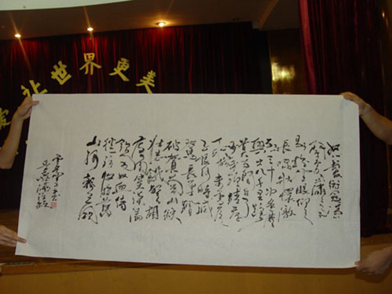 第二阶段:我们的风采。贫困生们“八仙过海,各显神通”,以各种形式在舞台上展示了他们的才艺。2004级贾蒙生的书法、李金彪的一曲《精忠报国》等都赢得了台下老师和同学们的阵阵掌声。