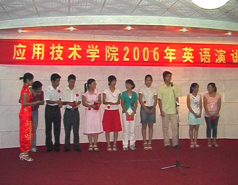 为了进一步提高同学们的英语口语水平,同时也给英语演讲爱好者提供一个展示自我的大舞台,5月23日下午,应用技术学院2006年英语演讲比赛在旅游学院多功能厅隆重举行。院党总支陈起敏书记、陈卫东副书记,学工办丁民宜副主任、吴淑康老师应邀观看了比赛。