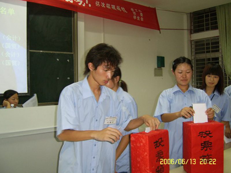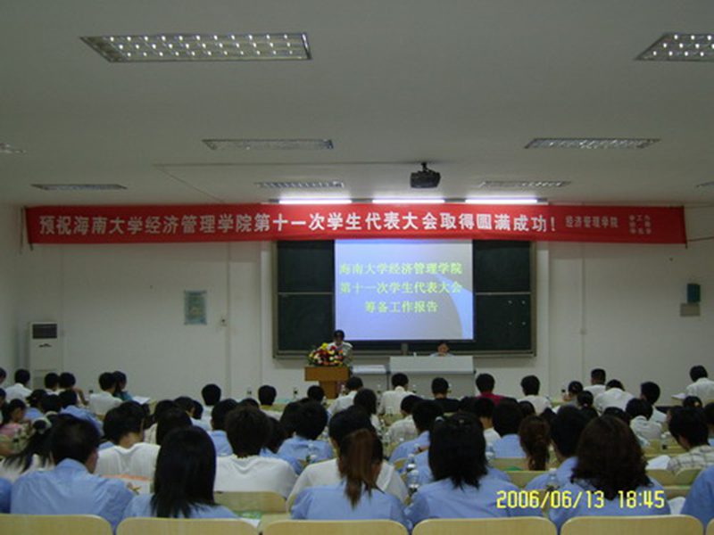 2006年6月13日晚7:00,经管学院第十一次学生代表大会在3-310室如期举行。此次大会由院学生会筹办、主持,得到了校团委、学院领导、校学生会和各兄弟学院学生会的大力支持。参加大会的代表共129名,其中女生代表45名,少数民族代表4名。到会的嘉宾有院党支部书记符史岱、副书记冯广波博士、学工办吴新主任、院团委谭继书记、张井富老师、王华伟老师以及校学生会和各兄弟学院学生会代表。