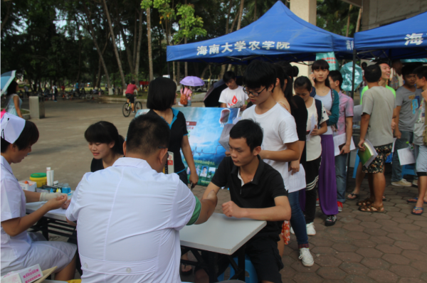 活动现场,献血知识、献血先进个人的宣传板和学校年度人物候选人何美丹同学先进事迹的海报吸引不少同学驻足观看并投票;献血的同学们有序的领取登记表并填写相关信息;研究生会的干部亲切地引导同学们献血,并通过与同学们的交流来缓解他们的紧张情绪;海南血液中心的医护人员认真了解同学近期身体状况,并仔细查验血液各项指标;献血后,学院为献血的同学们发放慰问品并送上节日祝福,整个活动秩序井然,温馨而感人。辅导员刘勇勤老师身先士卒,积极参与到献血活动中来,这已是他第三次参加学院无偿献血活动。