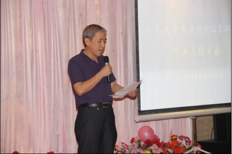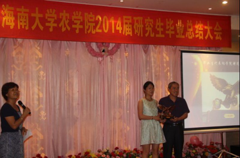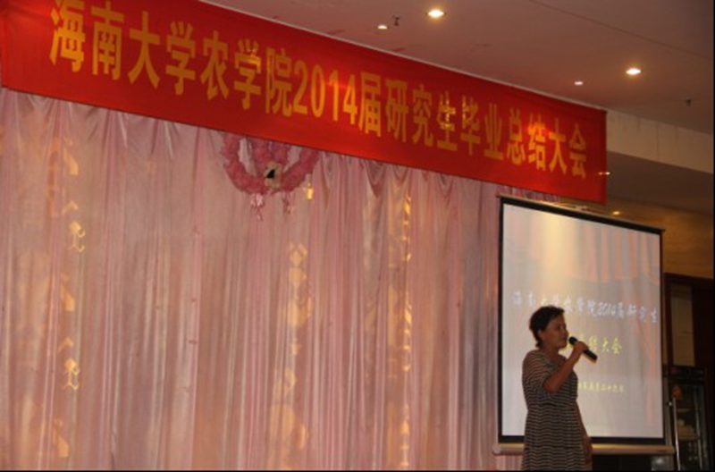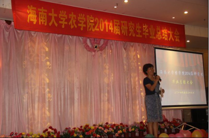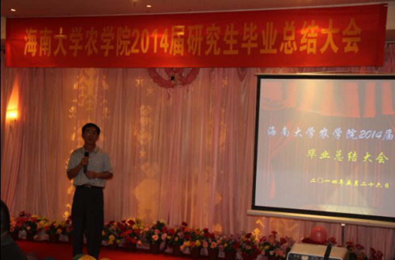 2014年5月26日晚7点,农学院2014届研究生毕业总结大会在揽海大酒店隆重举行,中国热带农业科学院副院长刘国道、研究生处处长张银东、农学院党委书记黄承和、农学院院长何朝族、常务副院长袁潜华、副书记邱志春、副院长陈银华等领导,部分研究生导师、学工办、教研办老师以及120余名研究生毕业生参加此次活动,大会由农学院罗丽娟副院长主持。