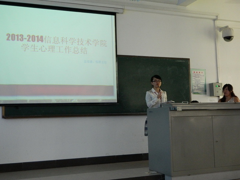 6月22日下午3时,2013-2014学年度信息科学技术学院心理工作室总结表彰大会在4教106召开,院党委蒙秋妍副书记,团委书记齐昌盛老师,学工办韩胜丁老师、齐有伟老师出席本次大会, 会议由13级电子1班宗琪瑶同学主持。 学院党委蒙秋妍副书记为大会致辞,并代表学院对心理工作室的工作给予充分肯定,动之以情晓之以理,鼓励大家以更加饱满的热情参加到学生工作当中去,在服务同学的同时也锻炼自己。心理工作室主任张舒对过去一年各项工作做了全面总结。之后,与会的师生共同参与素质拓展小游戏(搭桥过河和折报纸),既锻炼大家的协调及团队协作能力,也密切了师生之间的友谊。 最后,与会嘉宾为5.25心理活动月和《心语》征文获奖的组织和个人颁奖,全体师生合影留念。获奖名单详见(附件1、附件2)